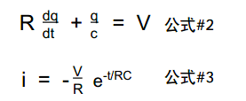 公式#2 和公式#3 陳述了一個電容電路的電壓和電流,而公式#3 是陳述電容性的放電比率